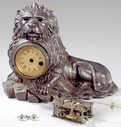 A Bradley & Hubbard blinking eye lion novelty clock. Eyes are intact, includes two Terry movements. Cast iron case is marked Bradley & Hubbard Patent ... [more detail available via subscription]