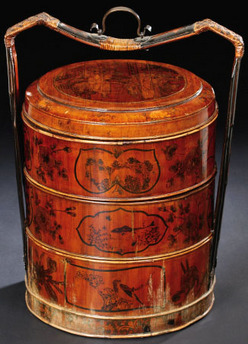 | | Food container, Chinese, with three compartments with fish and flower decoration, bamboo handle; image credit on full record. |
