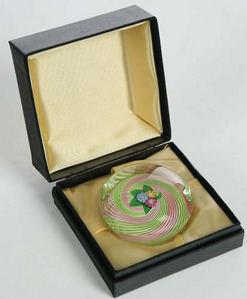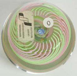 A Pertshire glass paperweight, three blue, red and yellow flowers against a green leaf on a swirling pink and green ground. Paper label on bottom, "Pe... [more detail available via subscription]