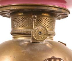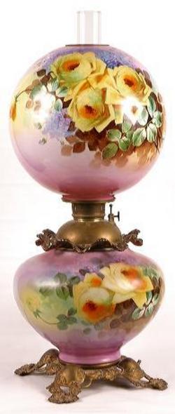 A large 19th Century "Gone with the Wind" lamp. Base and ball shade, hand painted large yellow roses on lavender background, excellent cast open desig... [more detail available via subscription]