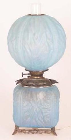 A Blue Grass "Gone with the Wind" electrified table lamp formed of light blue glass. The pattern is reminiscent of Tiffany's linenfold glass. The base... [more detail available via subscription]