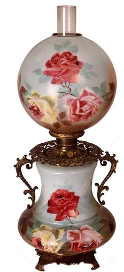 A large "Gone With the Wind" parlor lamp having hand-painted roses on its globe shade and concave reservoir, with brass "handles" and fittings.