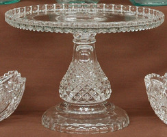 Early 20th century, clear pattern glass cake stand, unidentified pattern round scalloped edged foot supports a pineapple-like stem, and a round plate ... [more detail available via subscription]
