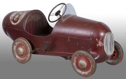 2011 Sale Offering: A pressed steel Triang No. 6 Racer pedal car, circa 1950s, boat tail race car body with windshield replacement. Great looki... [more detail available via subscription]