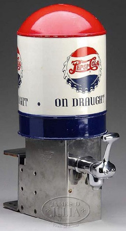 Pepsi-Cola soda fountain dispenser, On Draught with double dot Pepsi-Cola bottle cap, music box plays Pepsi jingle when glass is filled; image credit on full record.