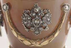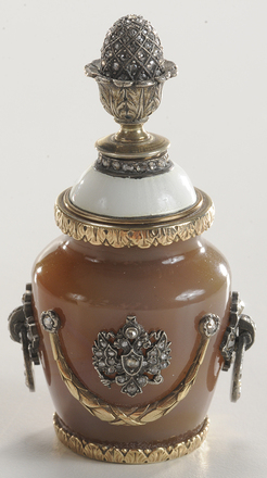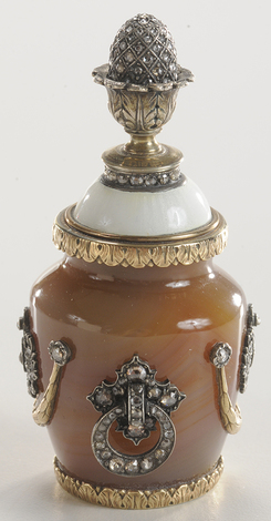 | | A Faberge or Faberge style gold mounted Agate scent or perfume bottle, Russian or German, finely crafted and formed as a miniature handled urn; image credit on full record. |