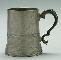 A tapered pewter mug with glass bottom. Marked "Watts & Harton, London", applied scroll handle.