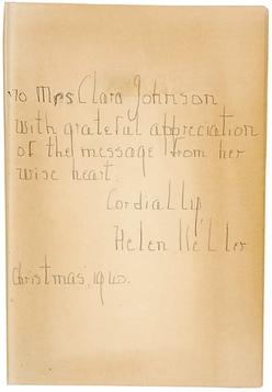 Autograph of Helen Keller, blind and deaf American author and lecturer. Book signed and inscribed in pencil: "To Mrs Clara Johnson with grateful appre... [more detail available via subscription]
