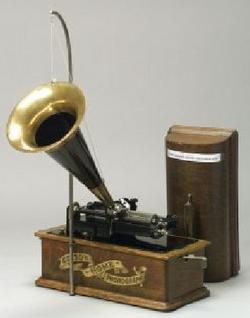 | | An Edison Home Model A Phonograph with C reproducer, a black and brass horn with bracket and 22 cylinders; image credit on full record. |
