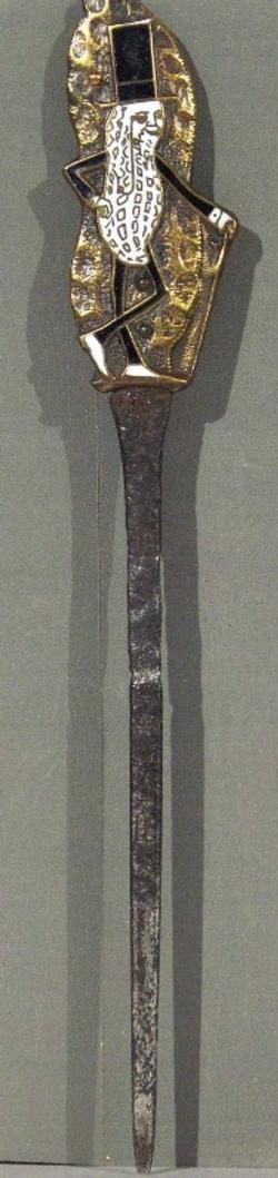 A Planters Peanuts Mr. Peanut enameled metal letter opener. 1920s letter opener with black and white enamel character.
