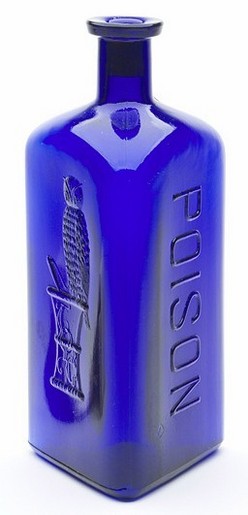| | An Owl Drug Company cobalt blue poison bottle with owl perched on mortar and pestle; image credit on full record. |