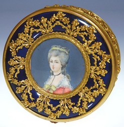 A French porcelain box with gilt metal floral swags placed over a cobalt blue ground. The portrait of a noble woman is depicted in the center of the c... [more detail available via subscription]
