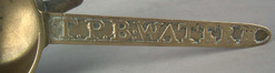 | | Posnet footed pot, bell metal, handle marked T.P.B. Water III, 18th century, detail of handle; image credit on full record. |