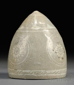 Pottery; Korean, Koryo Dynasty, Stirrup Cup, Conical, Flowers & Sangam Inlay, Celadon, 3 inch.
