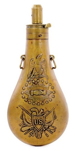 A U.S. 1850 brass "Peace" powder flask marked "BATTY, ADK, 1850" on spout base, "K" on spout ferrule [oval of stars and eagle decoration].