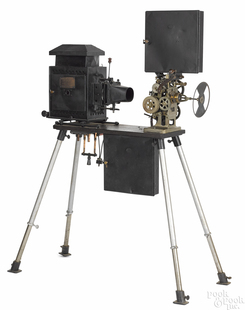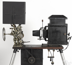 A Powers Cameragraph early hand crank projector on a four-legged base, with a label reading Swaab Film Service Co./ Philadelphia, PA/ Sole Agent for P... [more detail available via subscription]
