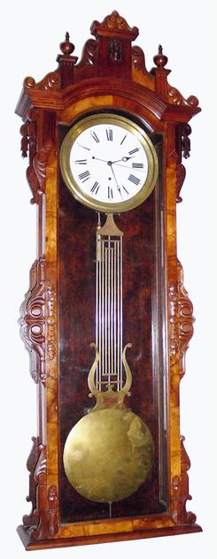 Regulator Clock; Ansonia, Pinwheel, No 14, Gridiron Lyre Pendulum, circa 1885, 71 inch.