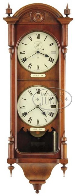 A Seth Thomas railroad regulator #6 [wall clock], last quarter of the 19th century. The walnut case having two 10" time dials labeled "Railroad Time" ... [more detail available via subscription]
