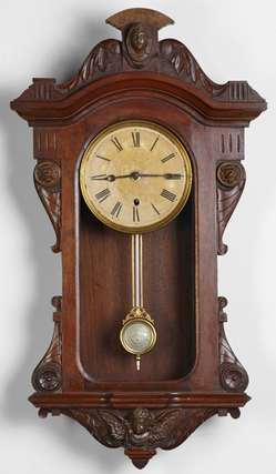 An E. N. Welch, Victorian wall regulator clock, carved walnut case. Original paper dial on metal pan. 8-day time only spring driven brass movement wit... [more detail available via subscription]