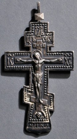 | | Russian silver Pectoral Cross, unidentified maker's mark, 84 zolotnik standard, the obverse with Christ crucified, the reverse with Tsar Nicholas II's cipher; image credit on full record. |
