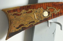 | | Brass inlays on the tiger maple stock of the J.M. Caswell signed Kentucky rifle; image credit on full record. |