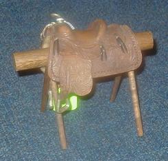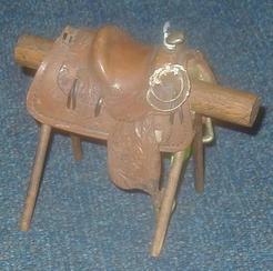 A miniature hand tooled leather salesman sample western style horse saddle.