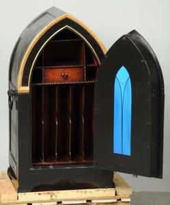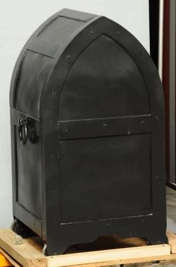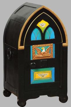 | | A side and back view of this unique 19th century Cathedral safe, on wheels with pull handle; image credit on full record. |