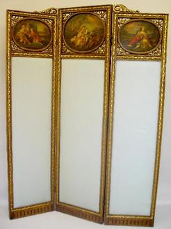 | A three part screen with painted panels and fluted base; image credit on full record. |