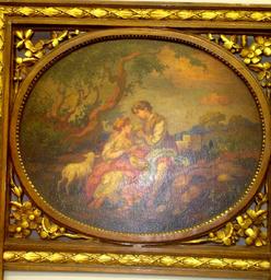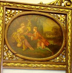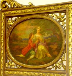 | A detail view of the handpainted panel in the upper part of screen; image credit on full record. |