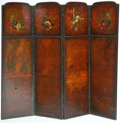 A four panel screen, leather on wood with handpainted floral and dead game images.