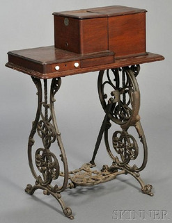 Sewing Machine; Thompson and Lincoln, Treadle, Wrought Iron Base & Wood Cabinet, 30 inch.