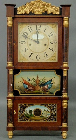 A circa 1830 to 1840 Empire mahogany veneered column and splat shelf clock by Barnes, Bartholomew & Co., original label, triple decker with painted ta... [more detail available via subscription]