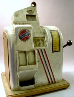 A Columbia three reel bandit amusement machine with 5 cent operation in chrome and oak case of Art Deco design.