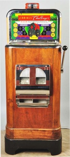 | The Jennings Challenger 5 cent slot machine with dual jackpots and original reverse on glass marquee; image credit on full record. |