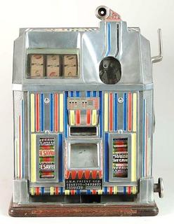 A Jennings Duchess Double-Jack vendor, "Bullseye" version with a glass coin-viewing window added to deter slugs. Aluminum front slot with oak case ret... [more detail available via subscription]