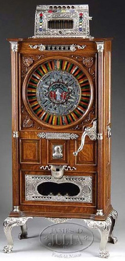 | | Mills Chicago slot machine, one-wheel slot machine in oak cabinet, rare music box with three bells; image credit on full record. |