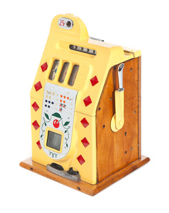 An American slot machine, ca. 1940s. Restored Mills 25 diamond machine with yellow paint and wooden sides. With keys. Restored. 26"... [more detail available via subscription]