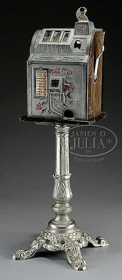 A Mills Poinsettia 25 cent 3 reel slot machine on a modern a nickel plated stand; image credit on full record.