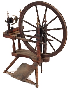 A Pennsylvania oak spinning wheel [with turned legs, spokes and wheel supports; worn red paint], circa 1800.