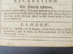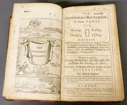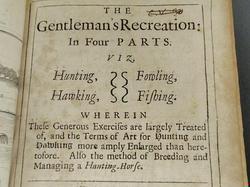 Early leather-bound book, The Gentleman’s Recreation in Four Parts- Hunting, Fowling, Hawking and Fishing...; image credit on full record. |