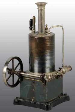 A Jean Schoenner upright No. 102 / 1 steam engine [vertical tank engine on box base with single flywheel], circa 1900. Interesting horizontal cylinder... [more detail available via subscription]