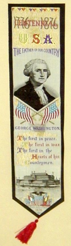 A framed and dated 1876, stevengraph silk book mark. 1776-1886, Centennial USA, printed across top with portrait of George Washington below with "The ... [more detail available via subscription]