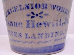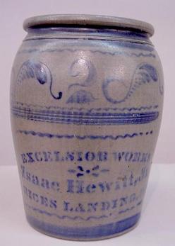 | | large stoneware crock having cobalt stenciling and freehand decoration. Signed "Excelsior Works, Isaac Hewitt, Jr, Rices Landing, PA", image courtesy of Garth's Auctions.; |