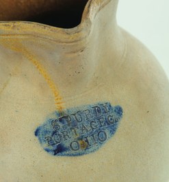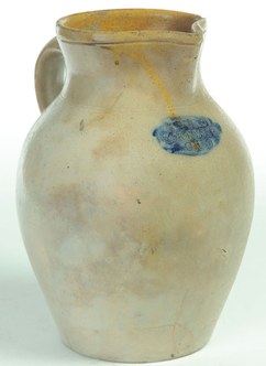 | | An ovoid stoneware pitcher with a tooled spout and cobalt daubs, by Solomon Purdy, Portage County, Ohio; image credit on full record. |