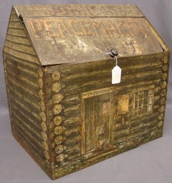 Large lithographed tin figural log house form coffee container for "Peacemaker" coffee by the Johnson Layne Co., circa 1915.