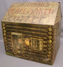 | | Johnson Layne Peacemaker Coffee country store coffee bin, lithographed tin log cabin with hinging lid; image credit on full record. |