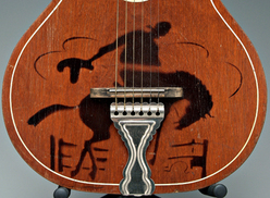Royalist guitar, mahogany body with stenciled cowboy designs, probably 1940s, with pasteboard case. Royalist is a house brand of the name for RCA Vict... [more detail available via subscription]