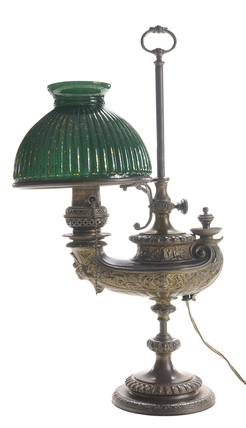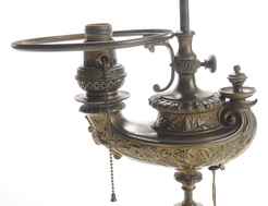 Tiffany and Co. bronze genie form student lamp, early 20th century, bronze genie form font with oil mounts, adjustable post and loop handle, base stam... [more detail available via subscription]