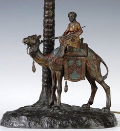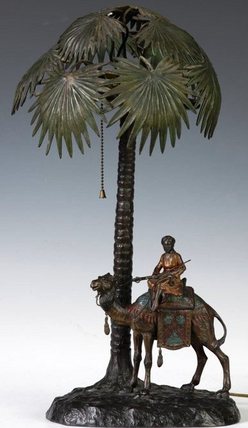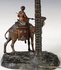 | An Austrian cold patinated or painted bronze table lamp, depicting an Arab on camel and palm tree; image credit on full record. |