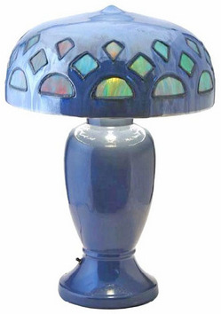 A Fulper table lamp having the ceramic shade inset with small panels of blue-green leaded slag glass on a classically-shaped, two-socket base, covered... [more detail available via subscription]